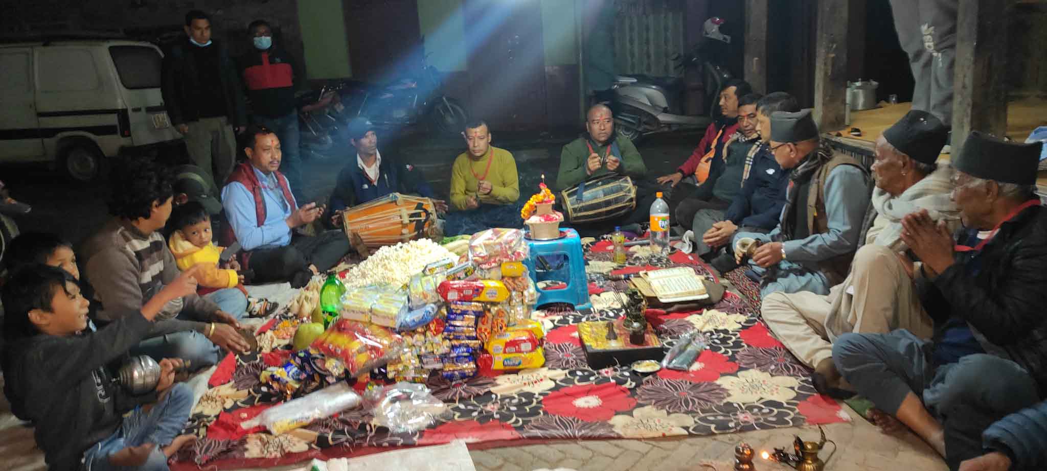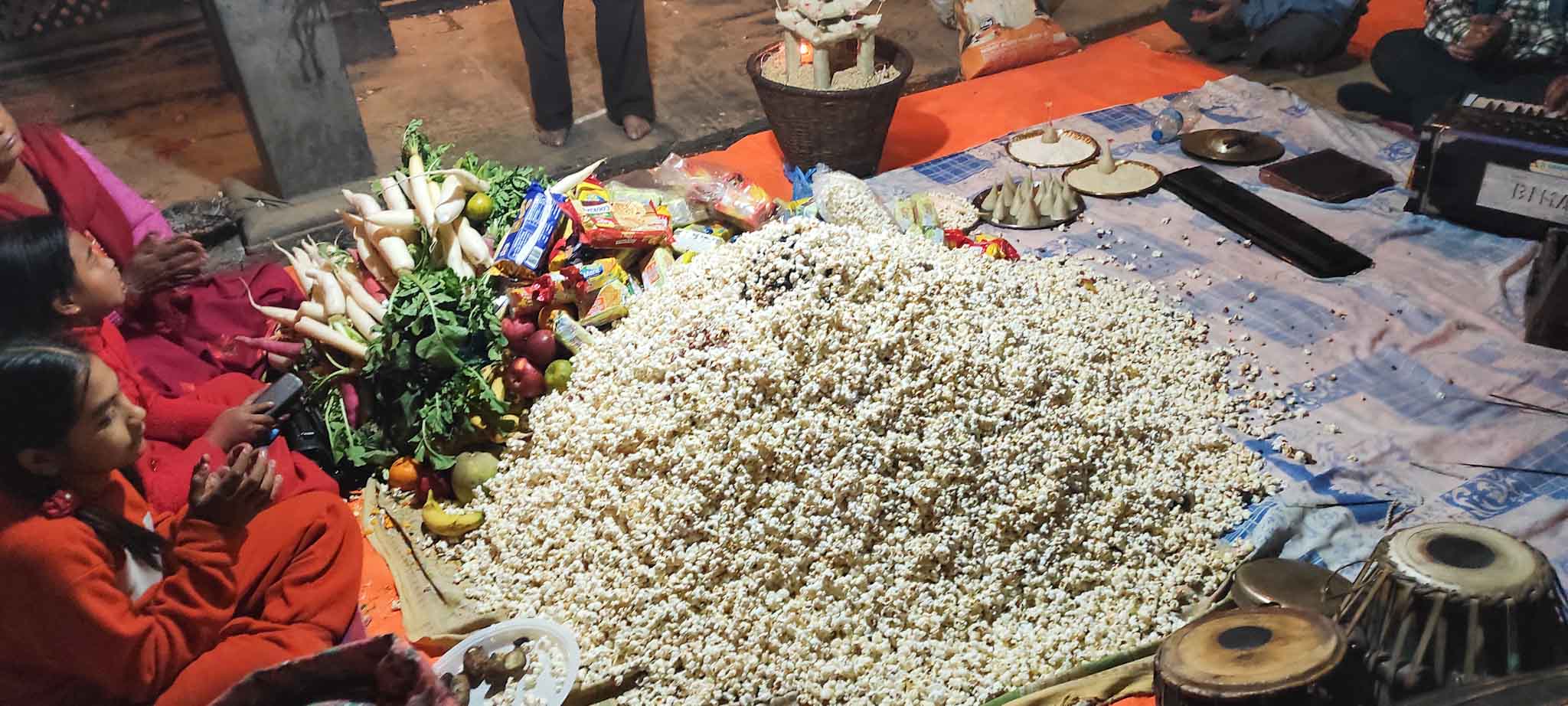 देखिएको थियो । माहोल यस्तो सिर्जित थियो कि प्रत्येक टोलटोल बाट सयौंको संख्यामा भजन मन्डलीहरू बाजागाजा सहित भगवानको स्तुती गाईरहेका थिए भने घरघरबाट थालीमा भुतेका मकै ,भट्मास,अन्न र कन्दमुल बोकि मानिसका ताँती बाटो भरी हिंदीरहेका थिए ।